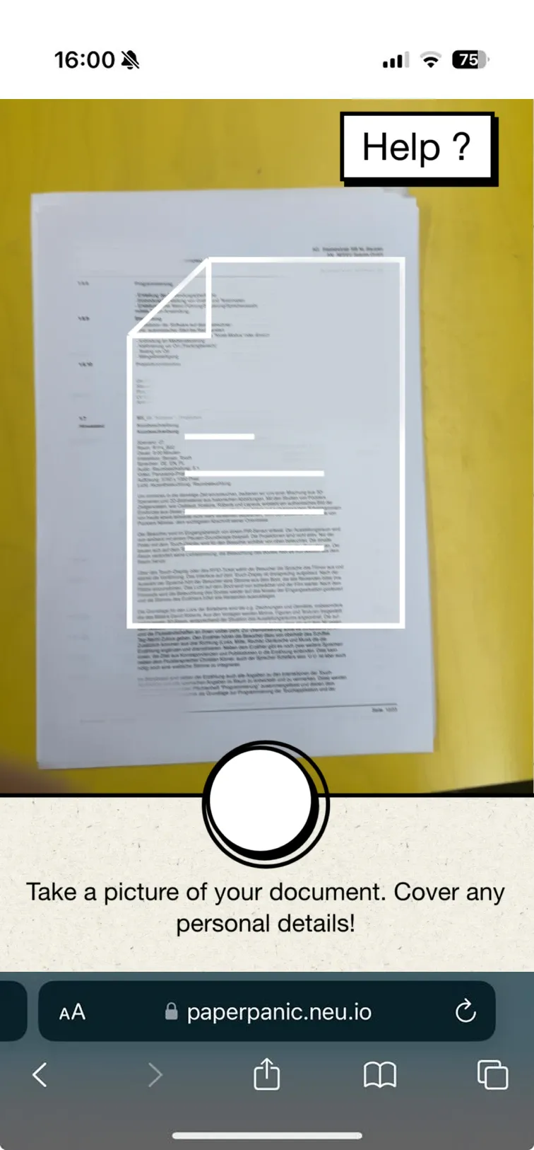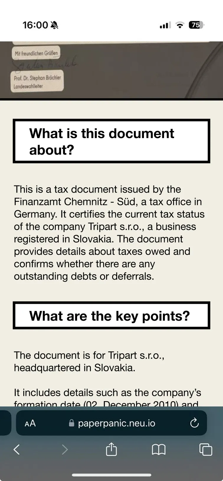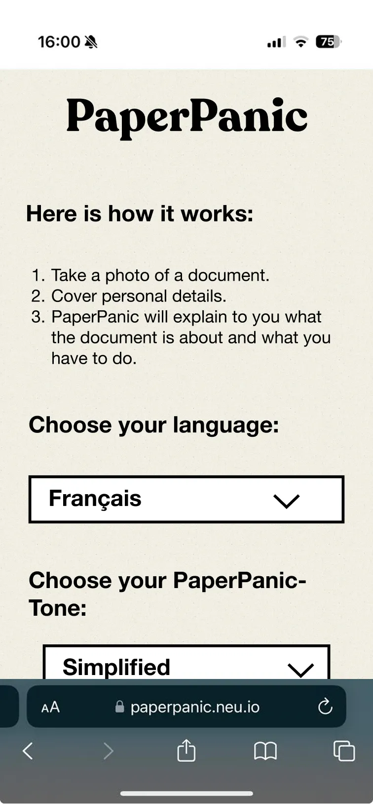 PaperPanic is a small web app that helps you deal with official documents in seconds. Take a photo, get a summary, and get advice on what to do next. All without panic.